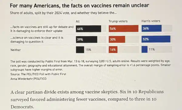 Results from the March poll of 3,851 U.S. adults conducted by Public First, show that a plurality of Americans question the safety of vaccines, support reducing the number administered, and believe that people’s right to decide what they put in their bodies is more important than preventing the spread of disease.
