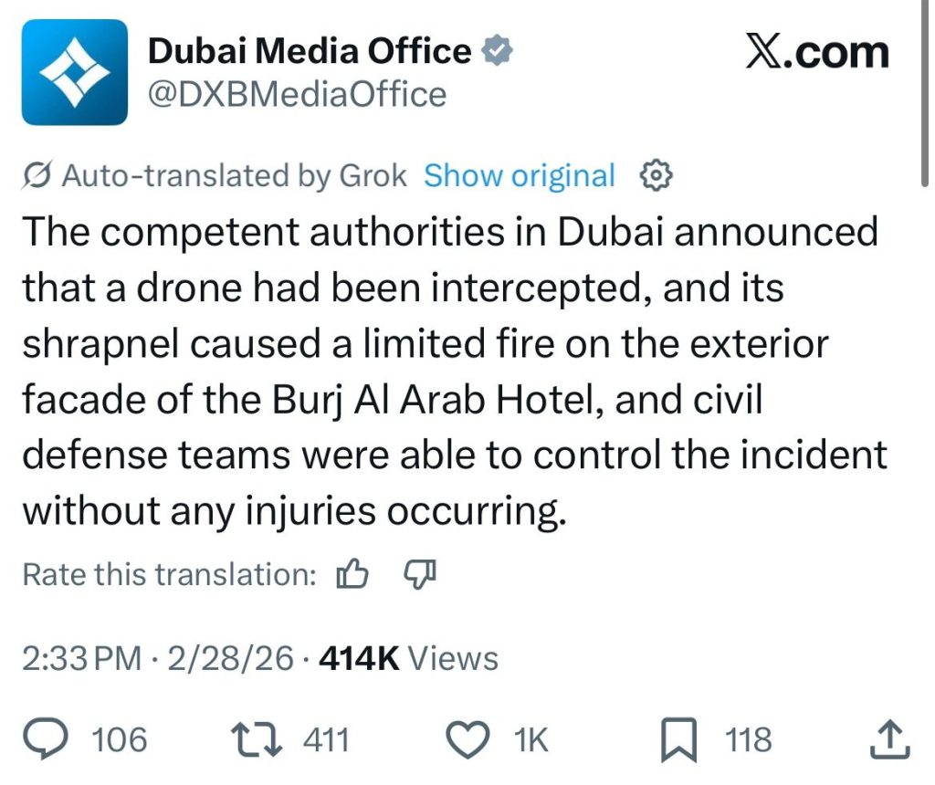 Dubai’s iconic five-star Burj Al Arab hotel was struck by an Iranian drone on Saturday evening.
