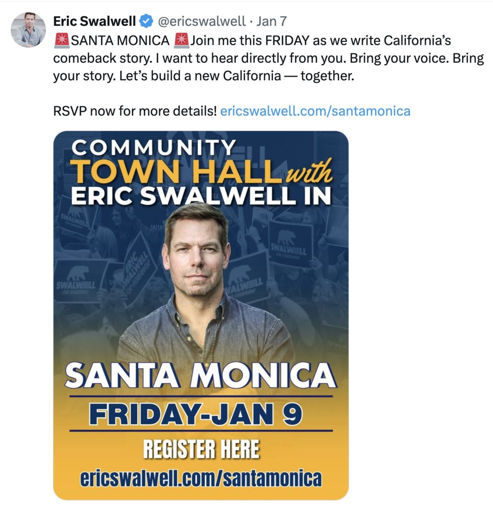 When Eric Swalwell announced a two-hour town hall meeting on his Twitter/X at Santa Monica High School, I immediately registered and downloaded a ticket.