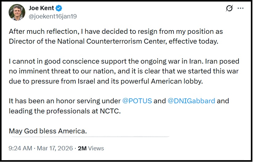 Kent, a senior deputy to Director of National intelligence Tulsi Gabbard posted his resignation letter on the X platform, writing: “I cannot in good conscience support the ongoing war in Iran.” … “Iran posed no imminent threat to our nation, and it is clear that we started this war due to pressure from Israel and its powerful American lobby.”