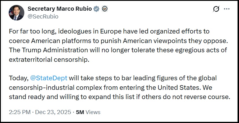 Read Full Article: https://theconservativetreehouse.com/blog/2025/12/24/secretary-of-state-marco-rubio-issues-visa-bans-against-five-eu-leaders-of-censorship/?utm_source=rss&utm_medium=rss&utm_campaign=secretary-of-state-marco-rubio-issues-visa-bans-against-five-eu-leaders-of-censorship