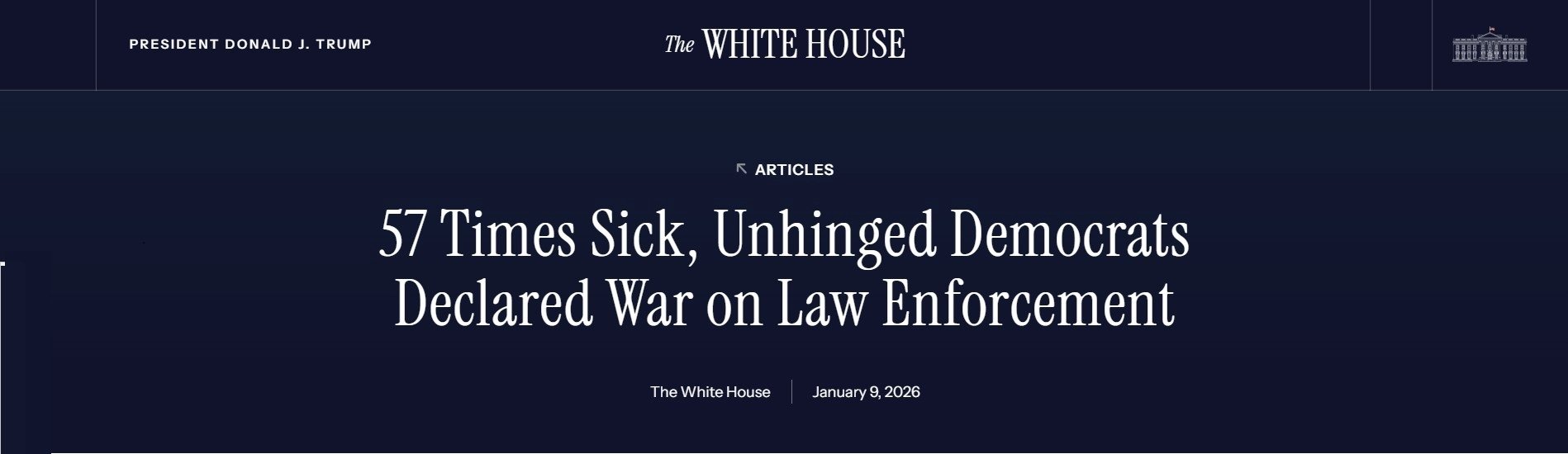 On National Law Enforcement Appreciation Day, the Trump Administration issued a statement outlining how Democratic officials and activists have repeatedly used extreme and inflammatory rhetoric against U.S. Immigration and Customs Enforcement and law enforcement more broadly. These attacks represent a sustained campaign by Democratic leaders to delegitimize and demonize federal officers. The administration emphasizes that this rhetoric is reckless and dangerous, and that it contributes to hostility and violence against law enforcement.