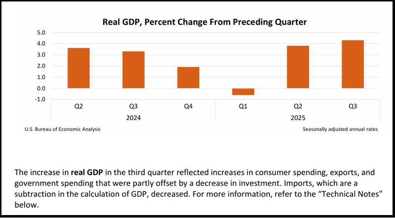 Real GDP increased at an annual rate of 4.3 percent in the third quarter, showing increases in consumer spending, increases in exports, and government spending offset by a decrease in investment. Imports, which are a subtraction in the calculation of GDP, decreased boosting the overall GDP number.